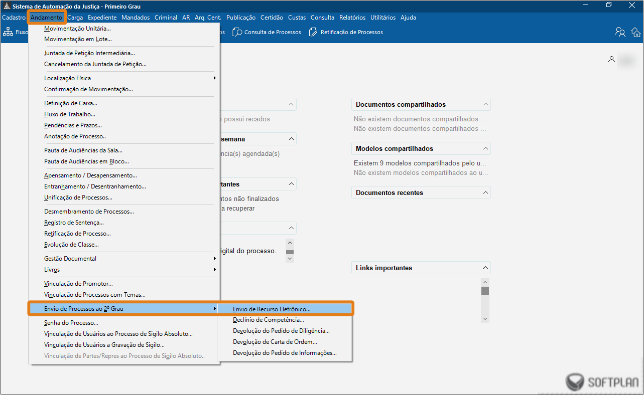 1. Na tela inicial do SAJ/PG, clique no menu Andamento, no submenu Envio de Processos ao 2º Grau, selecione a opção Envio de Recurso Eletrônico.