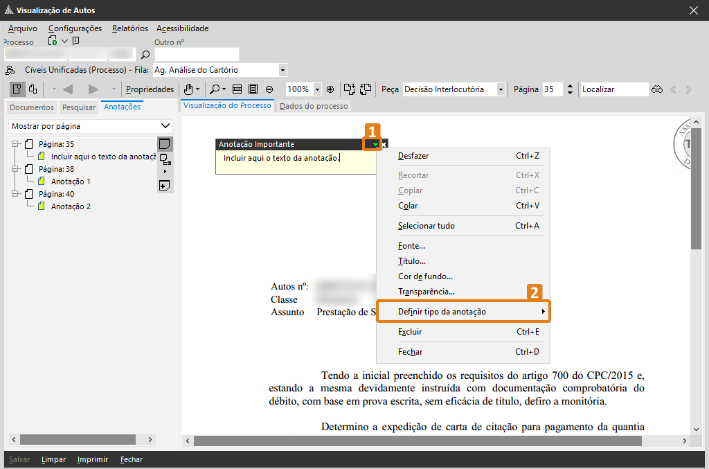As anotações funcionam como lembretes e reforçam a comunicação entre os usuários, auxiliando posteriormente na análise do processo. Desta forma, tanto você quanto outros usuários que também venham a trabalhar com o processo podem atentar-se para as observações contidas nas anotações.