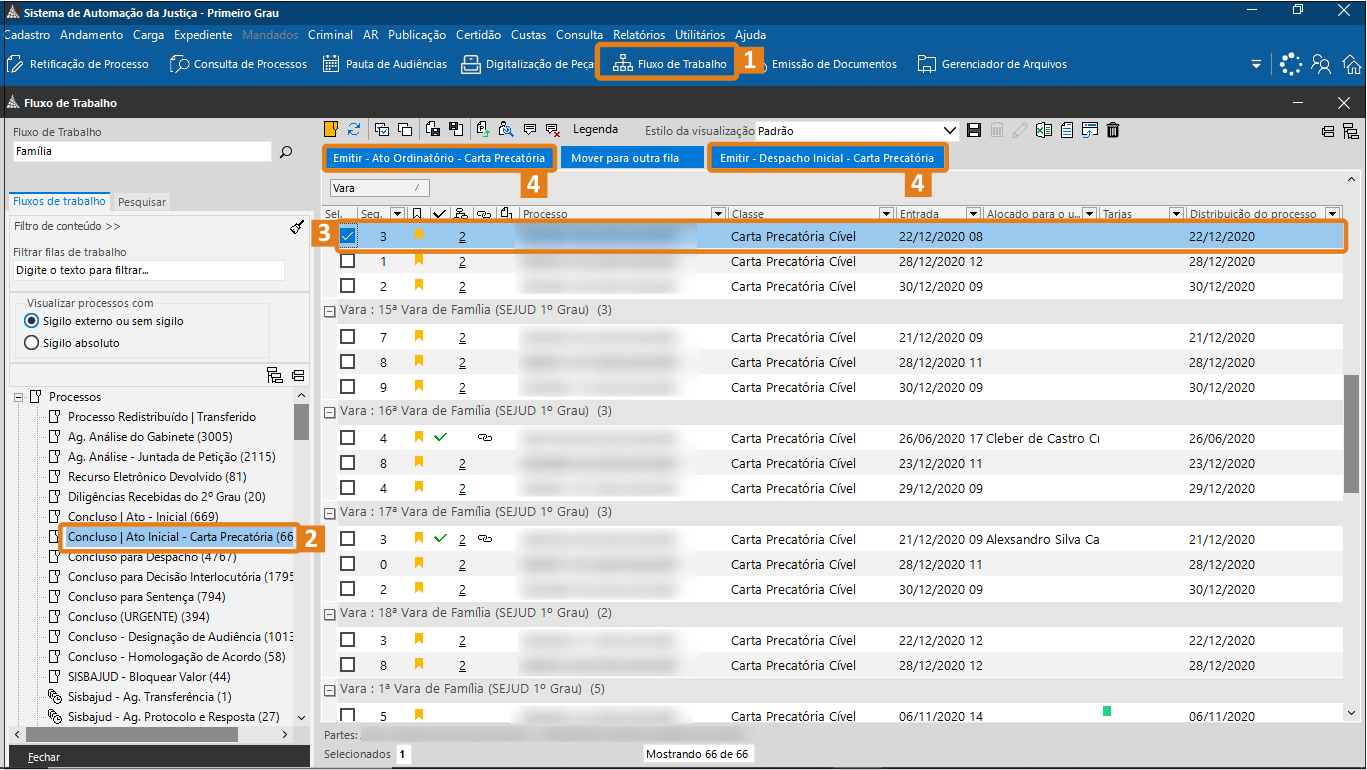 1.1. Acesse o ícone Fluxo de Trabalho (item 1 da figura) (ou clique no menu Andamento e submenu Fluxo de Trabalho). Clique na fila Concluso Inicial - Carta Precatória (item 2 da figura) e selecione o processo (item 3 da figura). Em seguida, selecione a atividade de Emitir - Despacho Inicial - Carta Precatória ou Emitir - Ato Ordinatório - Carta Precatória (item 4 da figura).