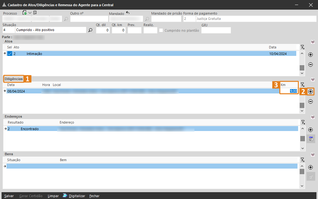 7. Na seção Diligências (1), clique no ícone representado por um círculo com um + no centro (2) para inserir a informação dos locais diligenciados. Em seguida, informe nos respectivos campos, a data, hora e a quilometragem (3).