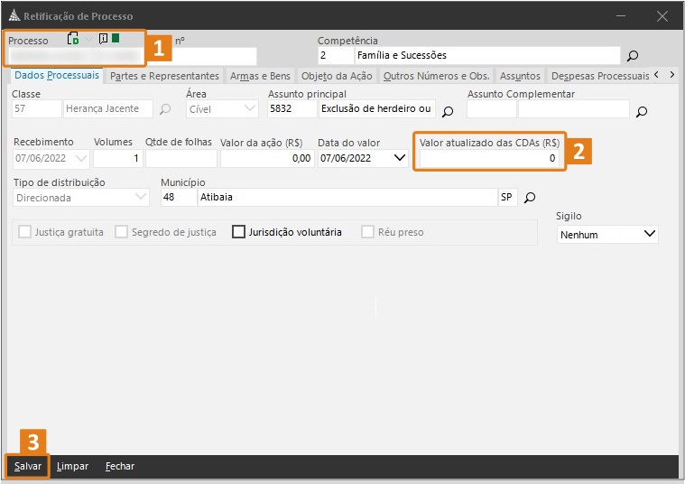2. Na tela de Retificação de Processos, informe o processo (1) que deseja remover a tarja, no campo valor atualizado (2) informe um valor inferior ao valor limite da configuração e clique em Salvar (3).