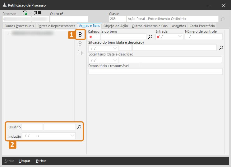 No canto inferior esquerdo da aba, há dois campos: “Usuário” e data da “Inclusão” (item 2 da figura), que correspondem ao nome e data da inclusão que determinado usuário cadastrou a arma ou bem no processo.