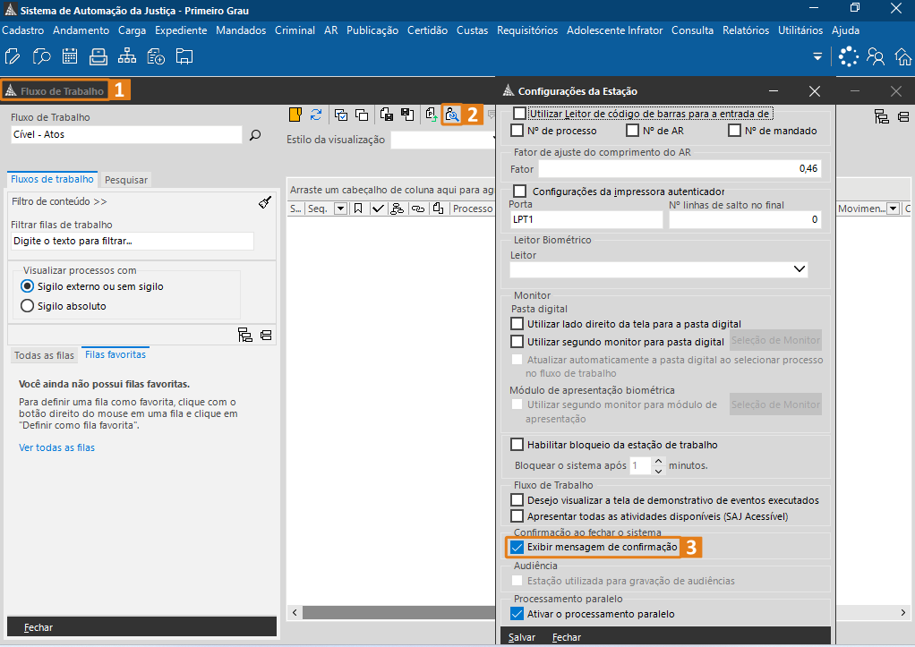 5. Na tela “Partes Ativas do Processo”, selecione uma ou mais partes (1) e clique no botão Selecionar (2). De volta à tela “Cadastro de Processos”, clique em Salvar (3).
