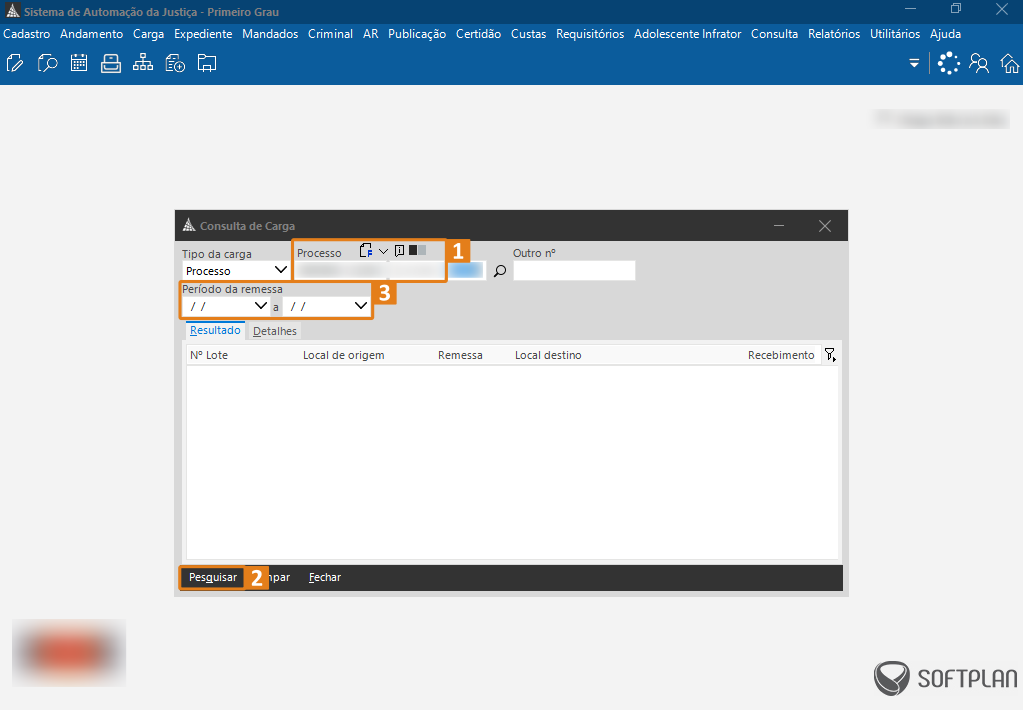 2. Na tela de Retificação de Processo, informe o número de processo (item 1 da figura) ao qual deseja retificar. Na primeira aba Dados Processuais (item 2 da figura), note que alguns campos já preenchidos, automaticamente, pelo sistema, não podendo ser alterados. Os campos que permitem alteração, você pode atualizar os dados, se assim desejar. No caso dos processos Criminais informe o documento de (item 3 da figura).