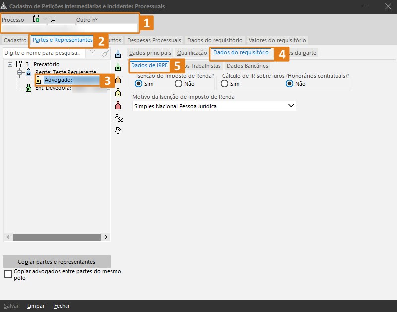 Passo 2. Em seguida, insira o número do incidente do requisitório (1), clique na aba “Partes e Representantes” (2), selecione o representante (advogado ou sociedade de advogados) da parte ativa (3) e na aba "Dados do Requisitório” (4), clique em “Dados de IRPF” (5).