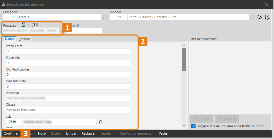 3. Insira o número do processo (1), preencha as informações necessárias ao edital (2), como “Prazo Edital”, “Prazo Ato”, etc e clique em “Confirmar” (3).