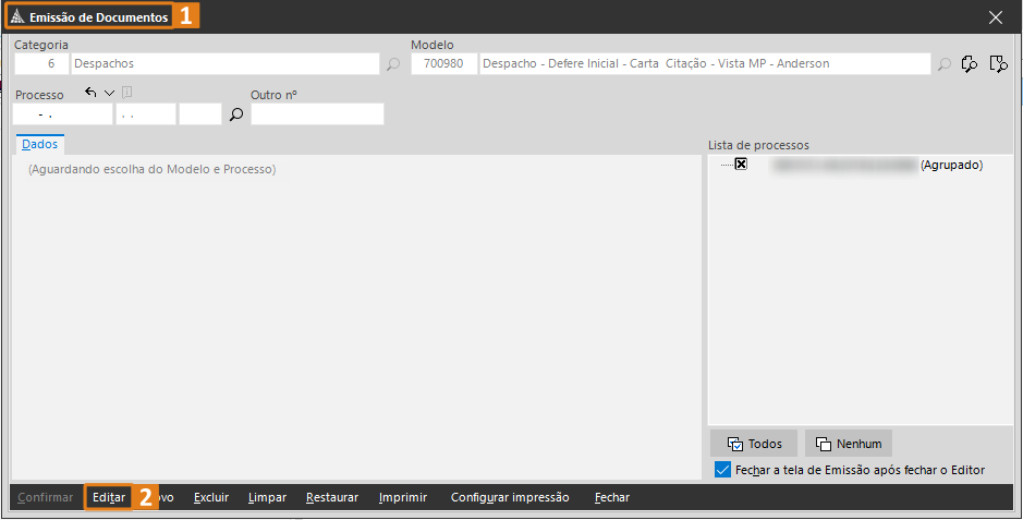 6. Na janela suspensa Emissão de Documentos (1), confira os dados e, em seguida, clique no botão “Editar” (2).