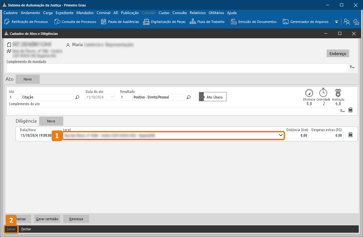 Passo 5. O endereço dos mandados com agrupamento de ato único por mesmo local de prisão ou pessoa jurídica com o mesmo CNPJ, podem ser alterados sem perder a característica de ato único. Para isso, na lotação de Oficial de Justiça, na tela "Cadastro de Atos e Diligências", altere o endereço do mandado no campo "Local" (1) e clique em "Salvar" (2) para manter o agrupamento.