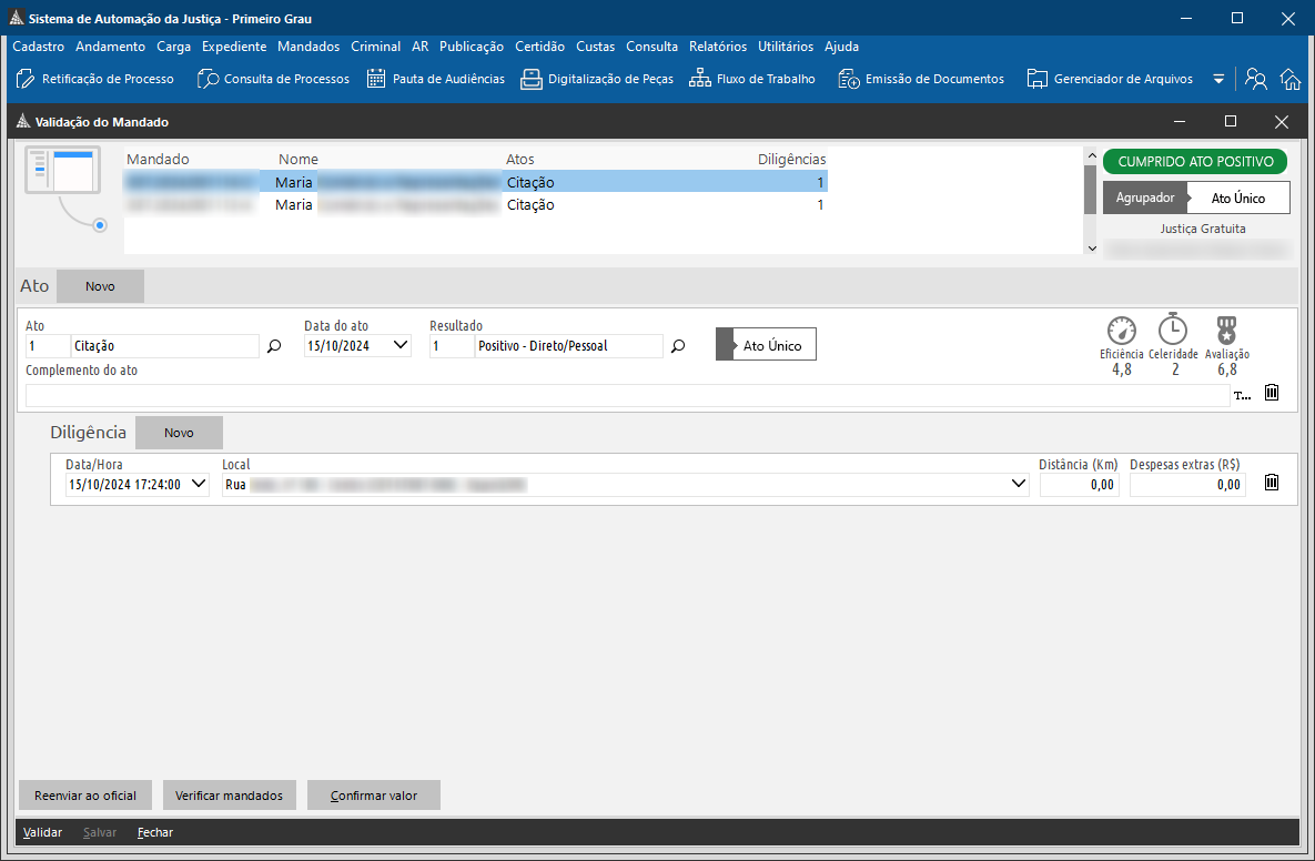 Também é possível visualizar a informação por completo do complemento do ato na tela de "Validação de Mandados", na lotação "Central de Mandados".