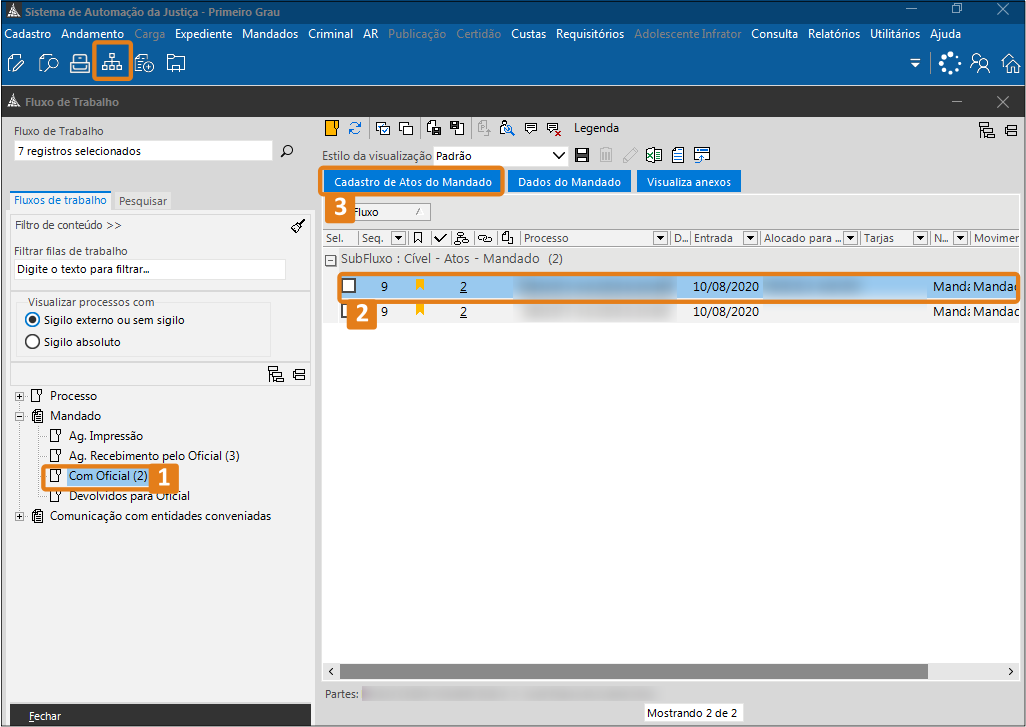 1. Na tela inicial do sistema, acesse o Fluxo de Trabalho. Em seguida, clique na fila Com Oficial (item 1 da figura), selecione o Mandado (item 2 da figura) e clique no botão Cadastro de Atos do Mandado (item 3 da figura).