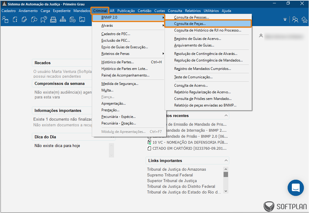 1. Acesse o menu Criminal, submenu BNMP 2.0 e clique na opção Consulta de Peças.