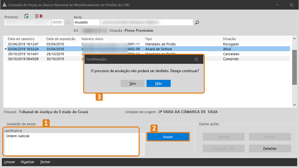 2. Informe o número do processo (item 1 da figura), da parte (item 2 da figura) e clique em Anular (item 3 da figura).