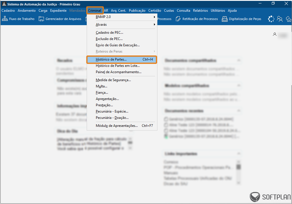 1. Acesse o menu Criminal, submenu Histórico de Partes. Você também pode acessar ela tecla de atalho Ctrl+H.
