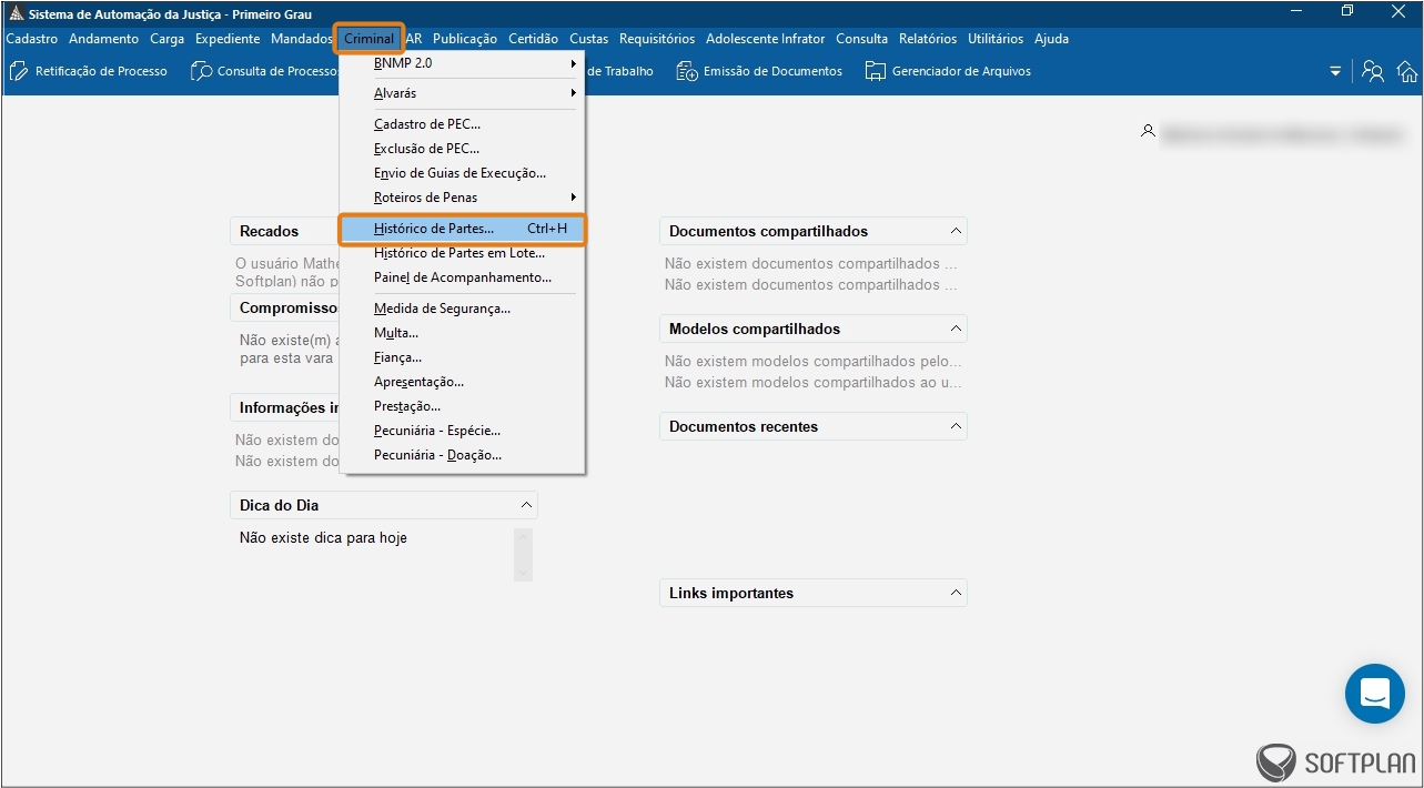 1. Acesse o menu Criminal e clique no submenu Histórico de Partes. Ou, se preferir, utilize a tecla de atalho Ctrl+H.
