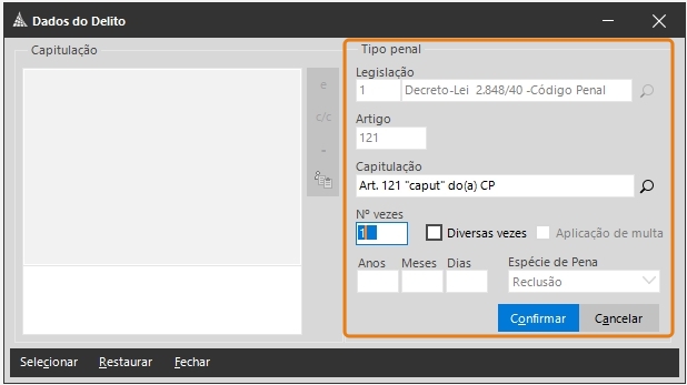 4. Após clicar na aba Sentença e inserir a capitulação informe a Espécie e de pena aplicada na sentença e selecione a opção privativa e restritiva, lembrando que, por padrão, o sistema seleciona automaticamente que a pena privativa foi substituída.5. Clique na aba Restritiva onde serão inseridos os tipos de restrição, anos, meses, dias ou horas e sua periodicidade imposta na sentença de acordo com as medidas alternativas da pena restritiva de direito.