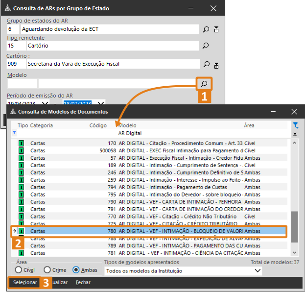 4. O parâmetro Modelo se refere ao modelo de expediente utilizado para a emissão do AR. Como nos parâmetros anteriores clique na lupa ao lado direto do campo (1) para abrir a tela de seleção. Selecione a opção desejada (2) e clique no botão Selecionar (3).