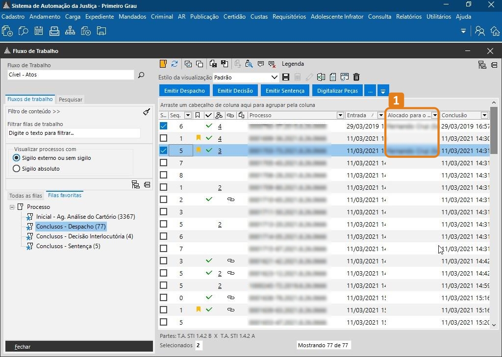 1. Na tela inicial do sistema SAJ de Primeiro Grau, clique no atalho de "Fluxo de Trabalho" (1). Com a janela do fluxo aberta, selecione a fila desejada (2) e escolha os processos ou documentos para alocar com o seu próprio usuário. Em seguida, clique com o botão direito do mouse sob o documento selecionado e clique em "Alocar objetos" (3).