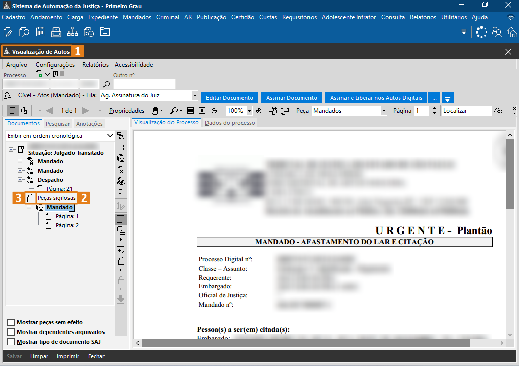 2. A tela Visualização de Autos (1) será exibida. Os documentos com sigilo vinculado aparecerão no agrupamento Peças sigilosas (2) com o ícone representado por um cadeado (3).