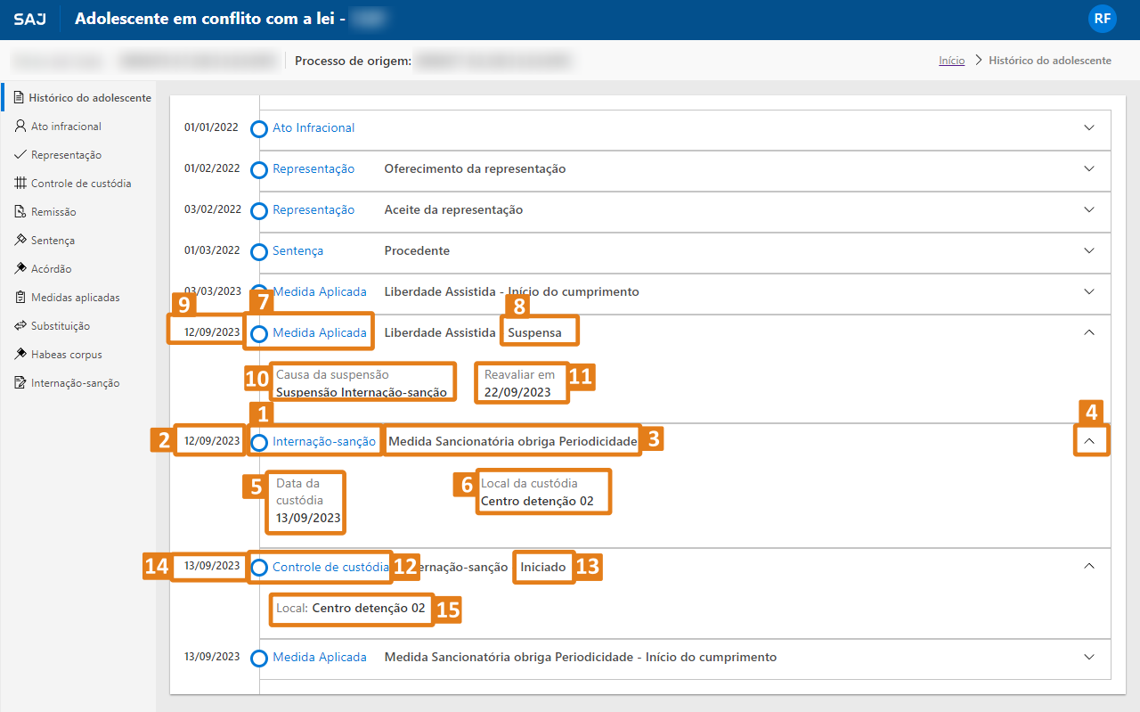 - Inicia automaticamente a medida sancionatória cadastrada, na mesma data da custódia. Essa medida fica disponível para acompanhamento na tela Medidas aplicadas (4) conjuntamente com as demais medidas do processo.