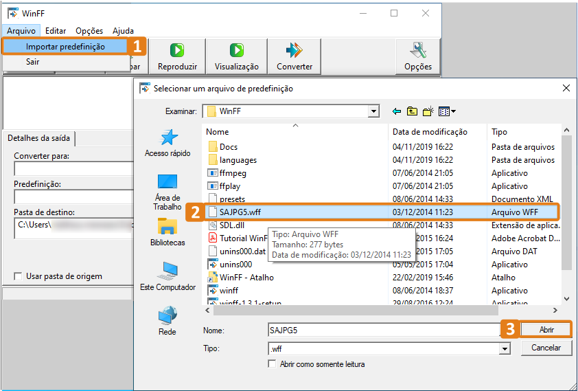 3. Para abrir o Aplicativo, clique em "Arquivo" e, em seguida, clique em "Importar predefinição” (item 1 da figura). Importe o arquivo “SAJPG5.wff” (item 2 da figura), dentro da própria pasta C:\WinFF. Clique em Abrir (item 3 da figura).