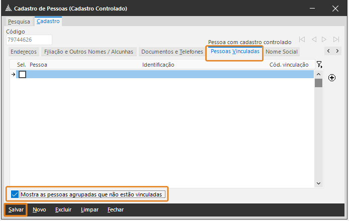 8. Na aba Pessoas Vinculadas, clique na caixa do campo “Mostra as pessoas agrupadas que não estão