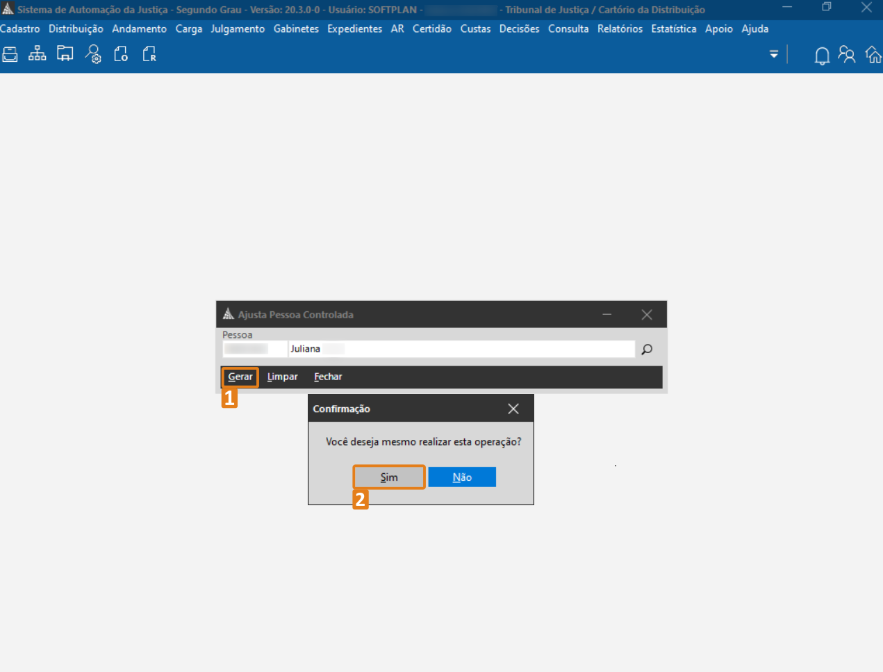 4. Com a pessoa selecionada, clique em Gerar (1) e, na sequência, confirme a operação clicando em Sim (2).