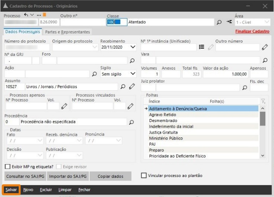 5. Será aberta a tela Cadastro de Processos – Originários com os dados do processo carregados, clique no botão Salvar.