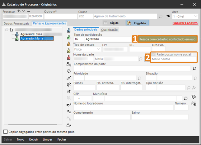 8. Se a parte tem cadastro controlado (1) e possuir nome social, a opção Parte possui nome social e o campo nome social apresentam o registro desabilitados para edição, ficando visível somente para leitura (2). A edição desta informação é permitida apenas no Cadastro de Pessoas (Cadastro Controlado).