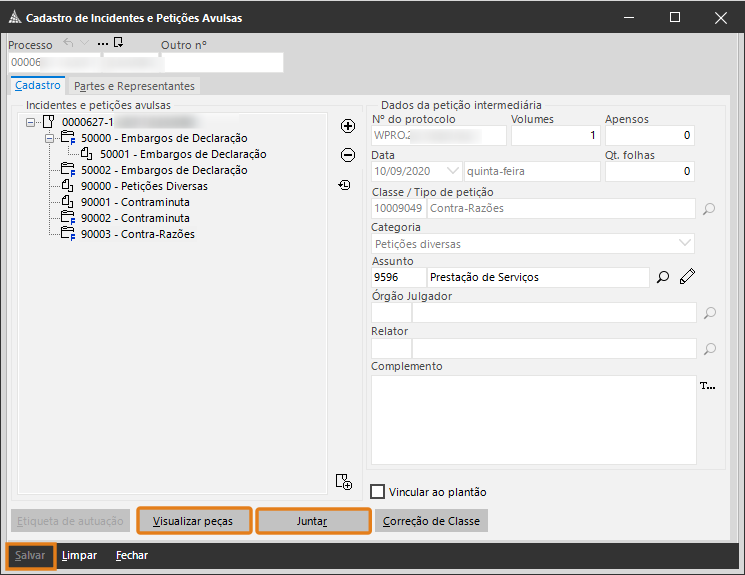 1.4 Após clicar no botão Salvar, os botões Visualizar peças e Juntar serão habilitados, para realizar a visualização das peças e a juntada da petição.