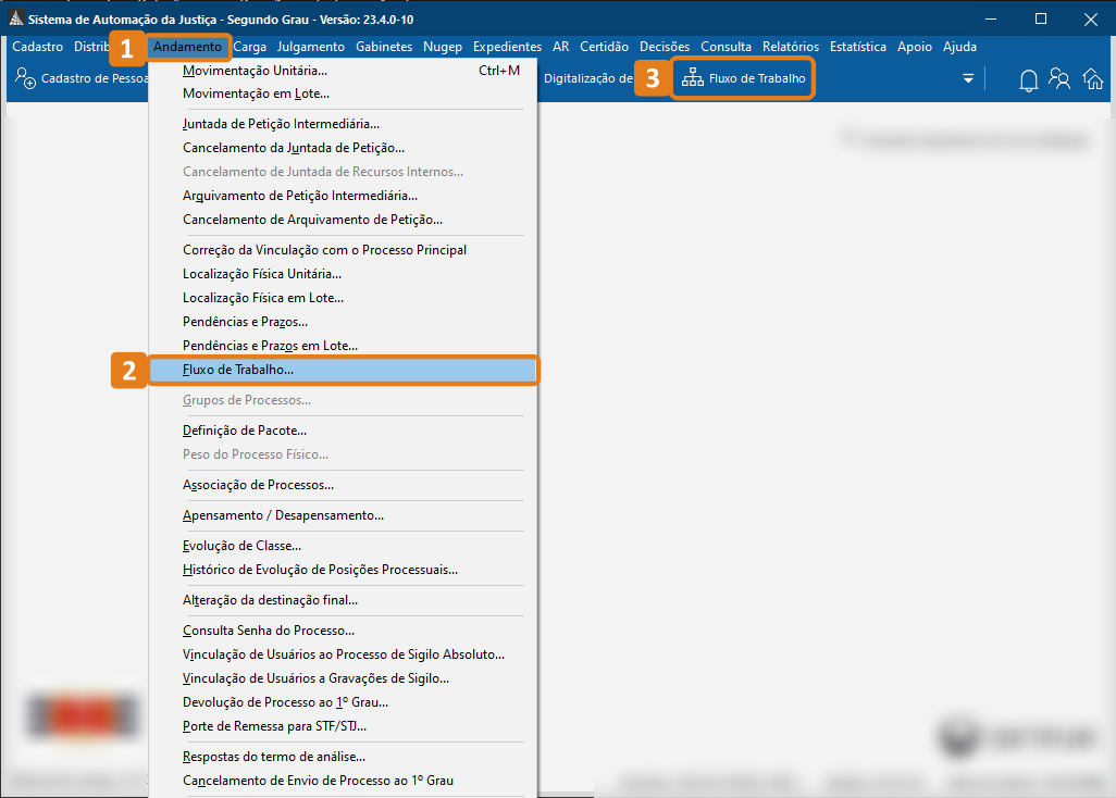 1. Acesse o menu "Andamento" (1) e clique na opção “Fluxo de Trabalho” (2) para abrir a pasta digital