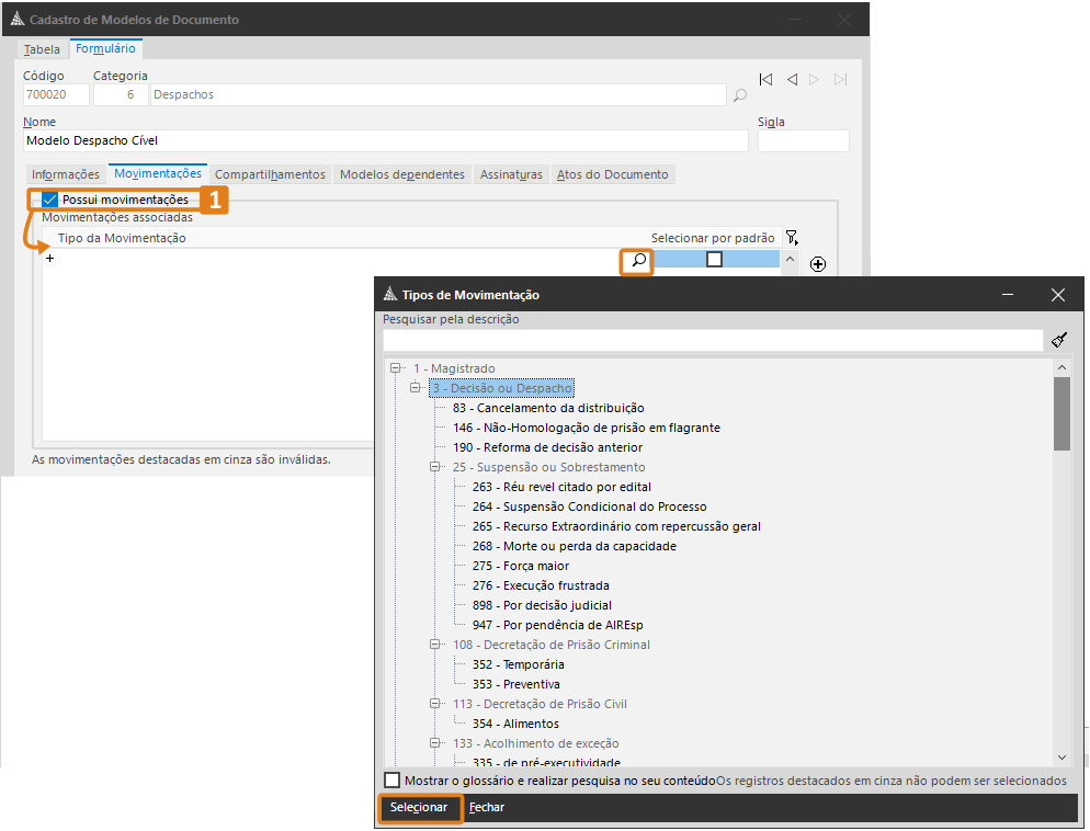 4. Em seguida, clique na aba "Movimentações", marque a caixa Possui movimentações (item 1 da figura), clique na lupa, abrirá a tela de "Tipos de Movimentação", selecione o tipo de movimentação que deseja vincular ao modelo de documento e clique no botão Selecionar. Em seguida, clique em salvar, para que o editor de texto abra automaticamente.