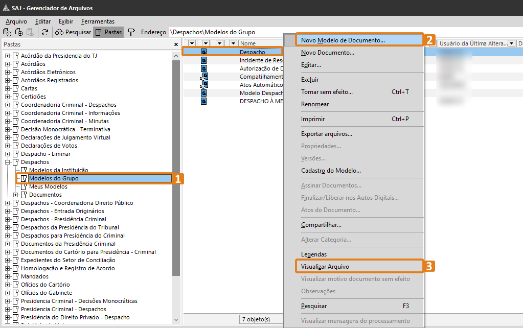 2. Na tela do Gerenciador de Arquivos, no campo das Pastas (tem 1 da figura), clique no símbolo (+) da pasta que estiver trabalhando (no exemplo, utilizamos a pasta Certidões, item 2 da figura) e dê dois cliques em Modelos do Grupo (item 3 da figura). Escolha um documento existente (documento que servirá como base) (item 4 da figura) e com o botão direito do mouse escolha a opção Novo Modelo de Documento (item 5 da figura).