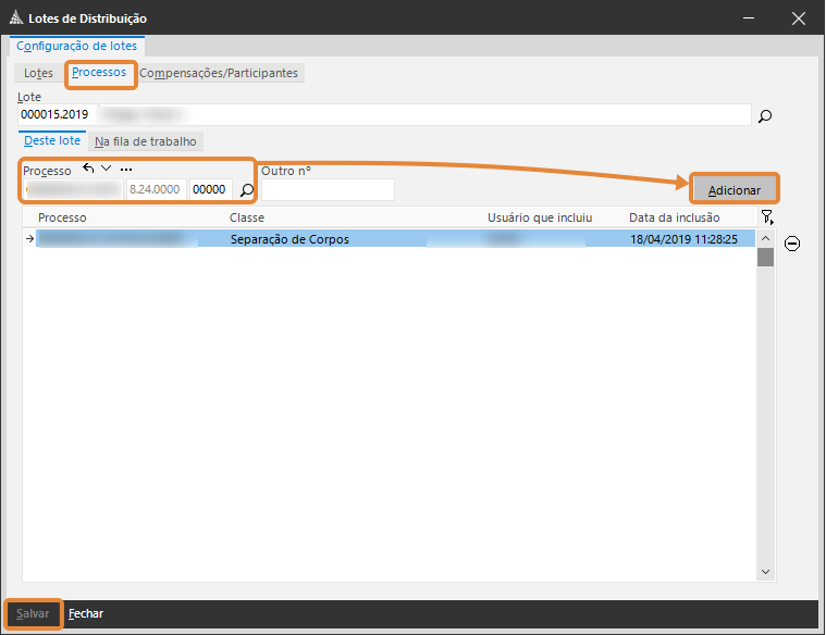 3. Ainda na tela Lotes de Distribuição clique na aba Processos, informe o número do Processo, clique em Adicionar para agregar o processo no lote criado e Salve as alterações.