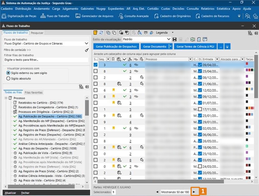 Em sua rotina de trabalho no SAJ é comum encontrar filas de trabalho com um grande volume de processos para trabalhar No entanto, a quantidade inicialmente apresentada para o usuário, assim que acessa a fila, é regulada por parâmetro do sistema a fim de garantir uma boa performance na visualização dos dados quando consultados. Quando a fila de trabalho ultrapassar a quantidade limite de objetos configurada para ser apresentada por página, será apresentado um mecanismo de paginação.