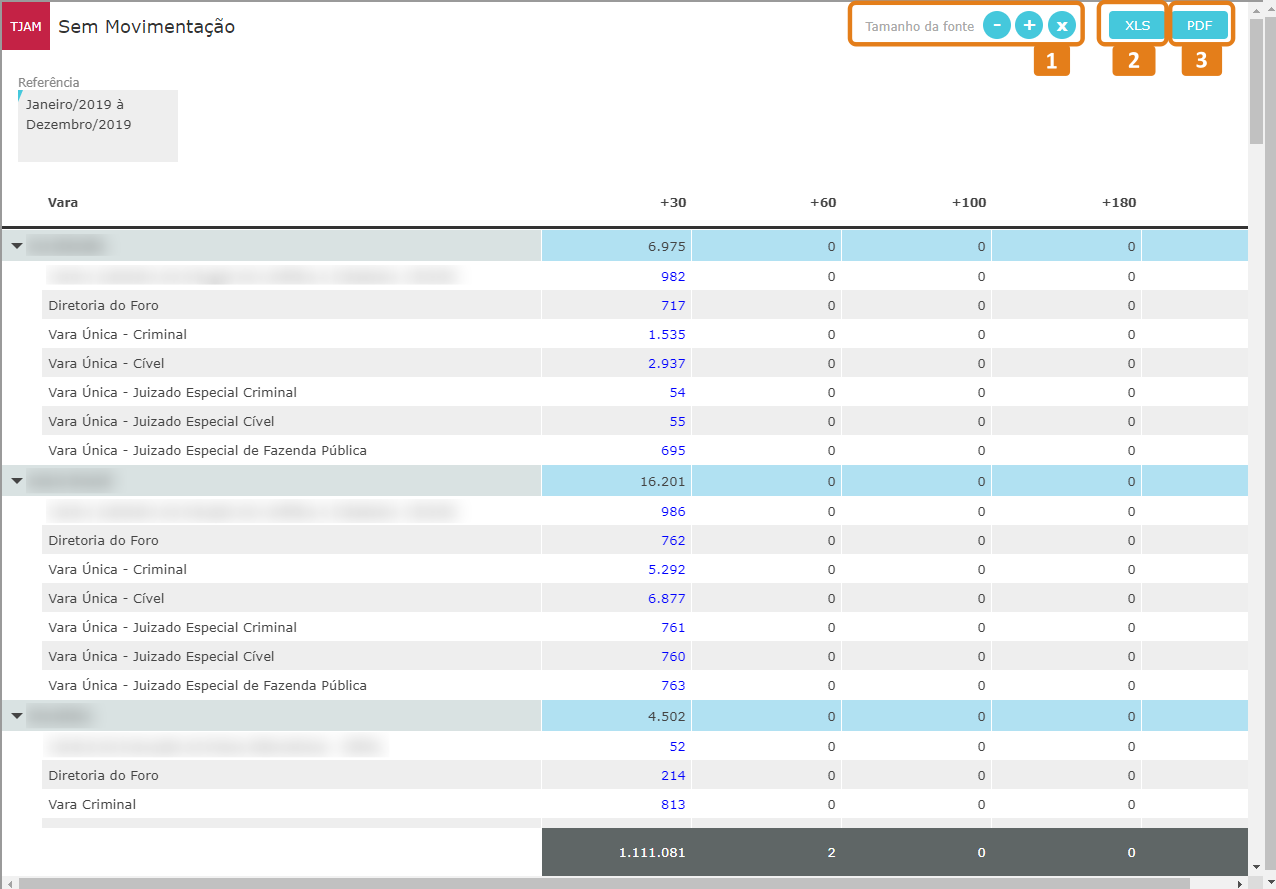 9. No exemplo abaixo, o relatório foi gerado com os filtros escolhidos no modelo colunar, o mesmo ainda apresenta opções de Tamanho da fonte (1), e opções de exportar para planilha XLS (2) ou PDF (3).