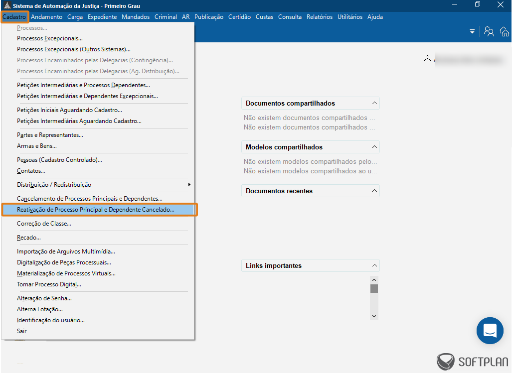 1. Acesse o menu: Cadastro e submenu Reativação de Processo Principal e Dependente Cancelado: