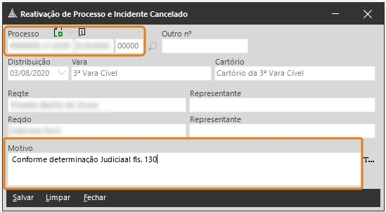 2. Preencha os campos "Processo" e "Motivo". Após informar o número do processo o sistema identifica se é principal ou dependente e verifica se o usuário possui autorização para reativar o processo. Clique em Salvar.
