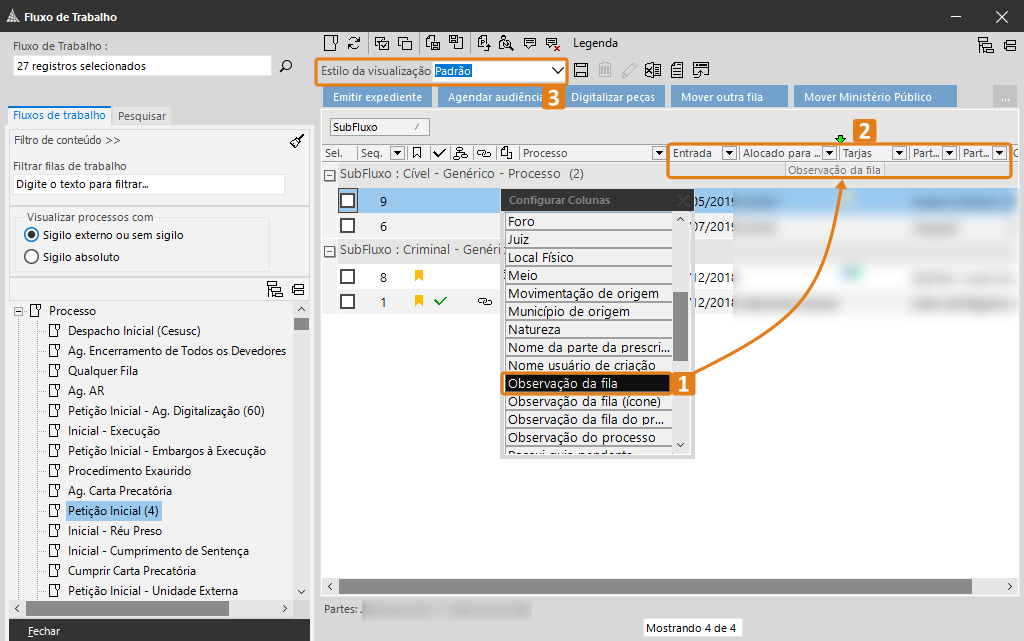 1. Acesse o Fluxo de Trabalho (item 1 da figura), clique com o botão direito do mouse em cima de qualquer um dos nomes existentes na coluna (item 2 da figura) e, então, selecione a opção Configurar Colunas (item 3 da figura).