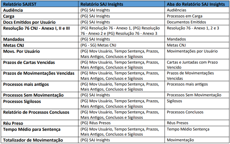6. Abaixo segue a lista dos relatórios do SAJ EST, a sua correspondência com cada relatório e a aba do SAJ Insights.