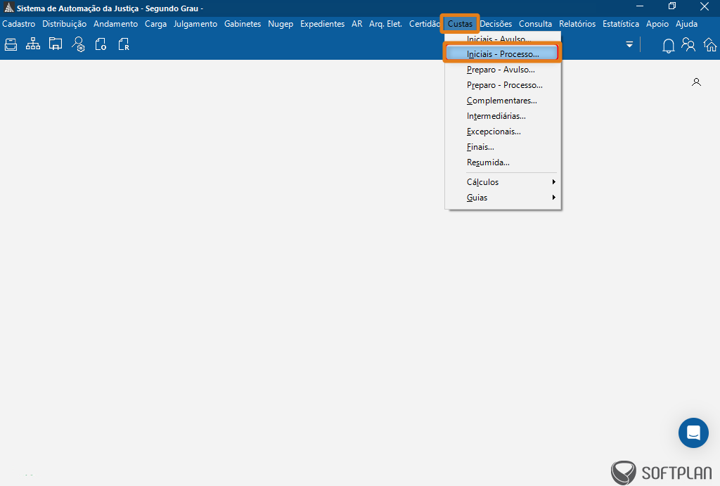 1. Acesse o menu Custas e clique no submenu Iniciais – Processo.