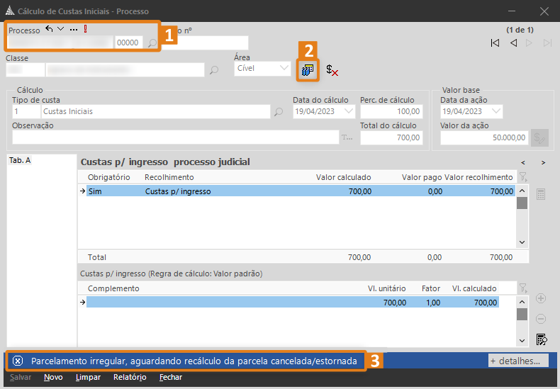 5. Se quiser verificar como ficou o cálculo, acesse o menu Custas – Iniciais Processo e informe o número do processo. Na barra de informações do cálculo totalizador (parte inferior da tela), aparecerá a mensagem “Parcelamento irregular, aguardando recálculo da parcela cancelada/estornada” (1). Clique no botão “Abrir parcelamento” (2).