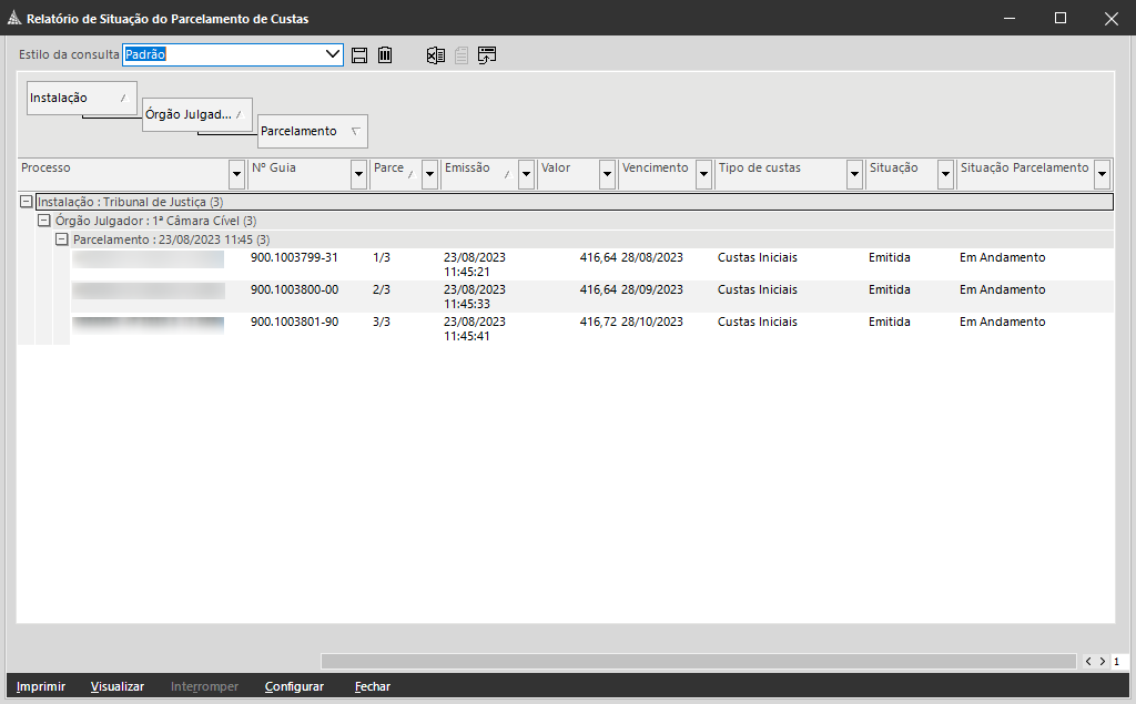 ObservaçãoAs informações apresentadas na tela de Parcelamento de Custas refletem a situação atual do parcelamento e não possui armazenamento de histórico, ou seja, serve para visualizar de forma unificada a situação de todas as parcelas do processo.