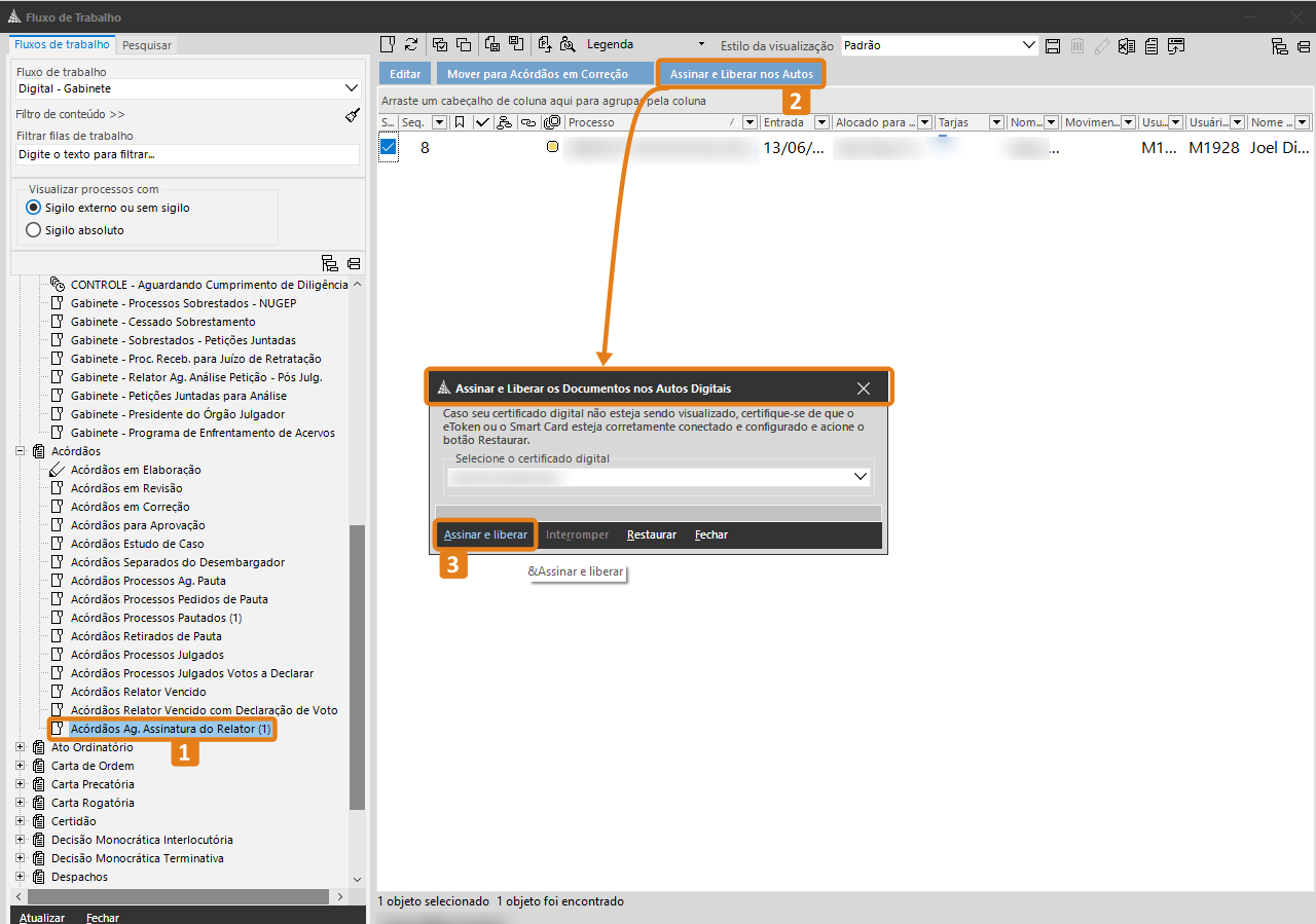 3. Na fila Acórdãos Ag. Assinatura do Relator (item 1 da figura), clique em Assinar e Liberar nos Autos (item 2 da figura), após será exibida a tela para realizar a assinatura digital. Nesta tela, clique em Assinar e Liberar (item 3 da figura).