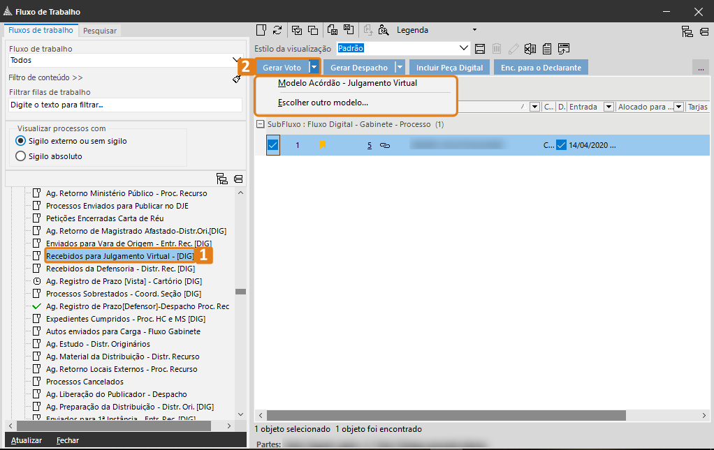 1. O processo poderá ser visualizado no Fluxo de Trabalho (1), subfluxo Julgamento Virtual (2), de acordo com o órgão julgador.
