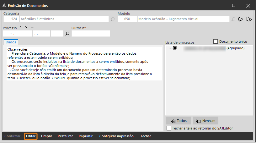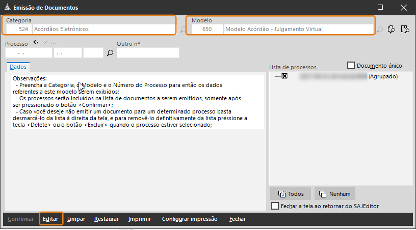 2. O sistema abrirá a tela de Emissão de Documentos e trará os campos Categoria e Modelo preenchidos automaticamente, clique em Editar para visualizar o documento de Acórdão.