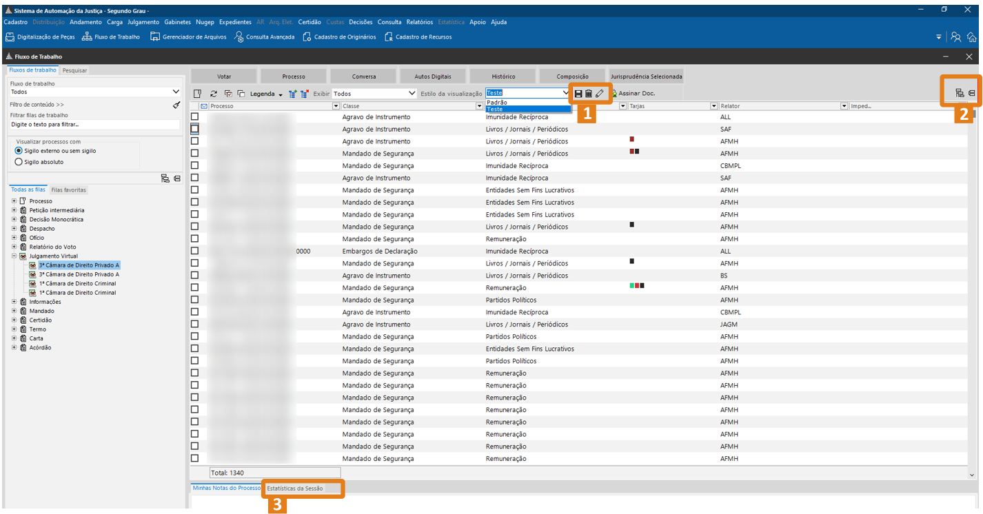 - Correção do nome da aba apresentada na parte inferior do painel do julgamento virtual de "Estatísticas da Sessão" para Estatísticas da Sessão (3).
