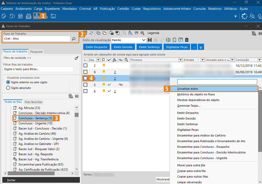 1. Na tela Inicial do SAJ, acesse o fluxo de trabalho através do botão representado por um ícone de fluxograma (1). No Fluxo de trabalho (2), selecione a fila desejada (3), escolha qual processo/documento (4) deseja trabalhar. Feito isso, clique com o botão direito do mouse na linha do processo e, em seguida, selecione “Visualizar autos” (5) para abrir a pasta digital.
