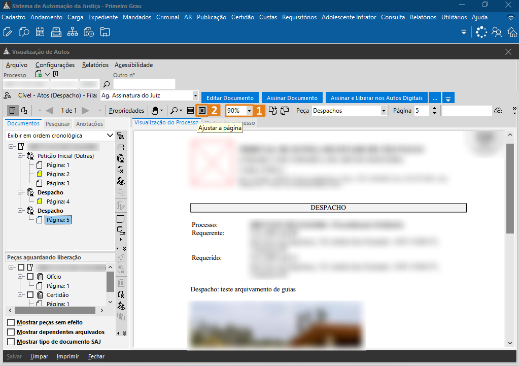 3. É possível ver que a página selecionada está visualizada a 90% do seu tamanho original (1). Esse é o tamanho padrão que o sistema apresenta os documentos. Para ajustar a página, clique no ícone representado por uma folha de papel em molde (2).