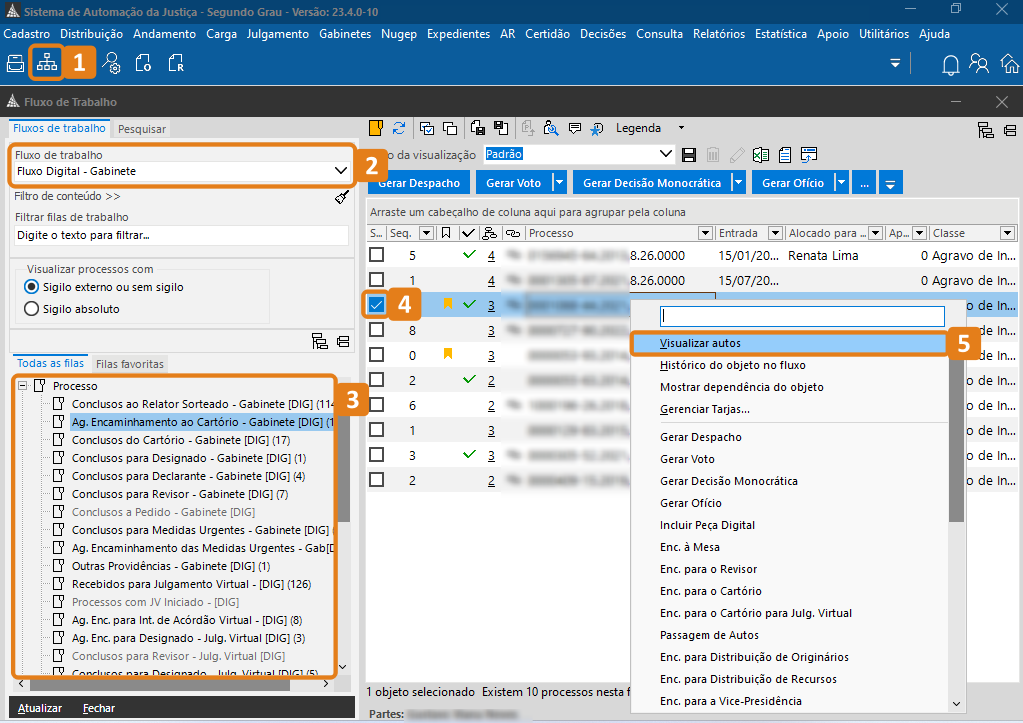 1. Na tela inicial do SAJ, acesse o “Fluxo de Trabalho” através do ícone "" (1). No ”Fluxo de Trabalho“, selecione o fluxo desejado (2) e escolha uma das filas de trabalho (3). Selecione o checkbox do processo (4), clique com o botão direito do mouse na linha dele e escolha a opção ”Visualizar autos” (5) para abrir a Pasta Digital.