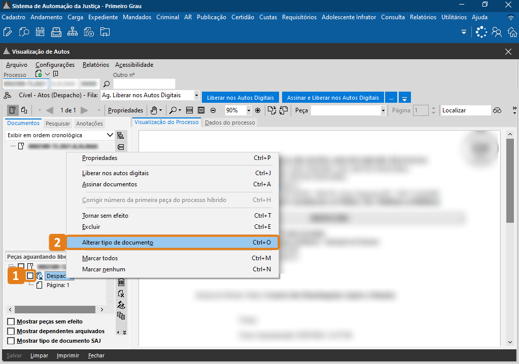 2. A Pasta Digital será apresentada. No agrupamento “Peças aguardando liberação”, selecione o checkbox do documento desejado (1), clique com o botão direito do mouse nele e selecione a opção “Alterar tipo do documento” (2).